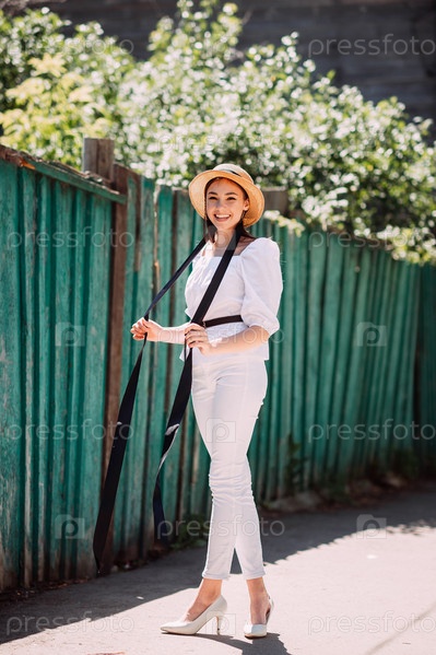 Счастливая девушка в маленькой шляпке и с букетом цветов 3600