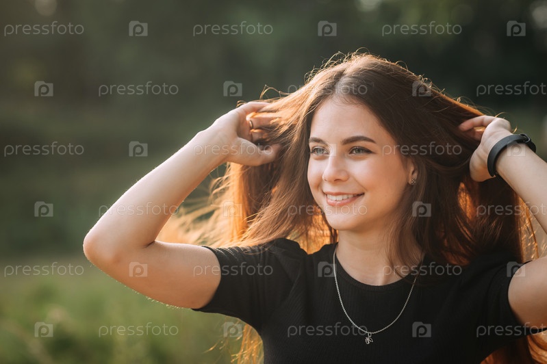 Радостная красавица гуляет в лучах заходящего солнца на природе 3662