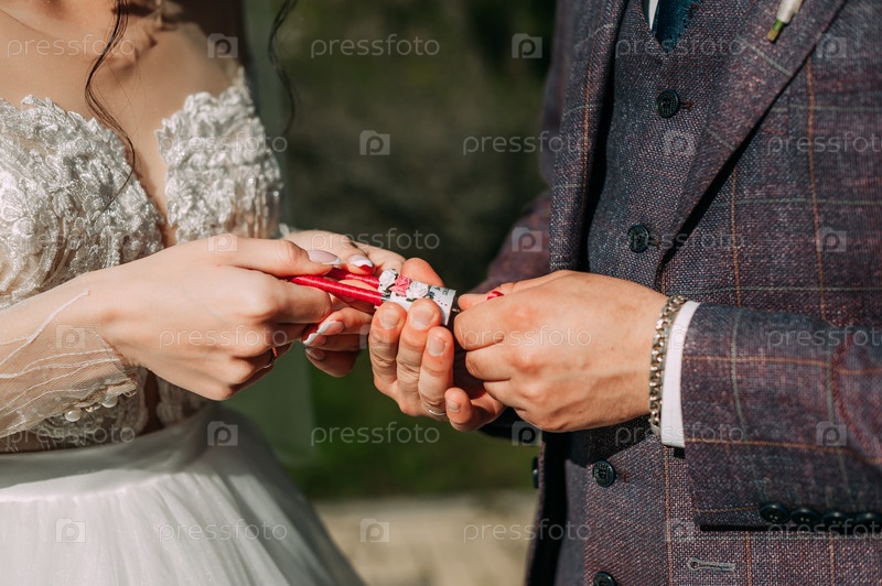 Молодожены держат в руках декоративный замок на долгое счастье 4317