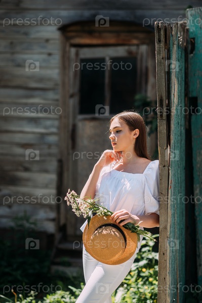 Юная девушка в белом платье и шляпке на летней прогулке 3553