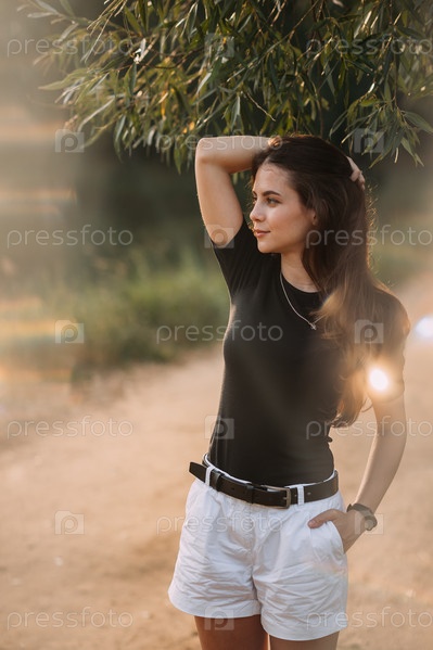 Юная красавица гуляет под лучами летнего солнца на лугах