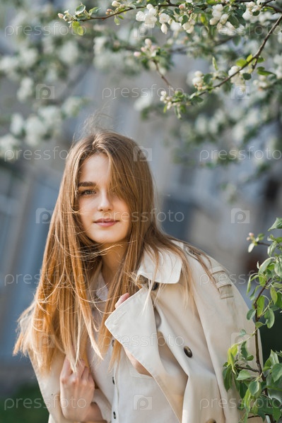 Красивая девушка в длинном бежевом плаще греется на солнышке 2974