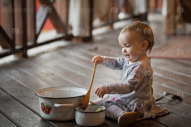 Годовалый ребенок играет на деревянном полу с кухонной утварью 3449