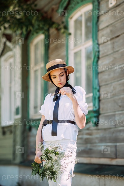 Девушка в шляпе и белой блузке ходит на фоне старых ву