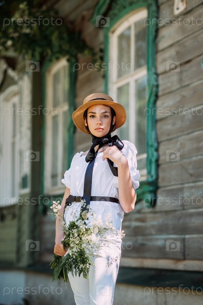 Девушка в шляпе и белой блузке ходит на фоне старых ву