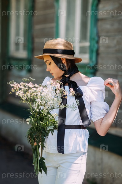 Девушка в шляпе и белой блузке ходит на фоне старых ву