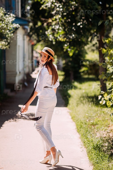 Молодая девушка в шляпке на фоне цветущих улиц города