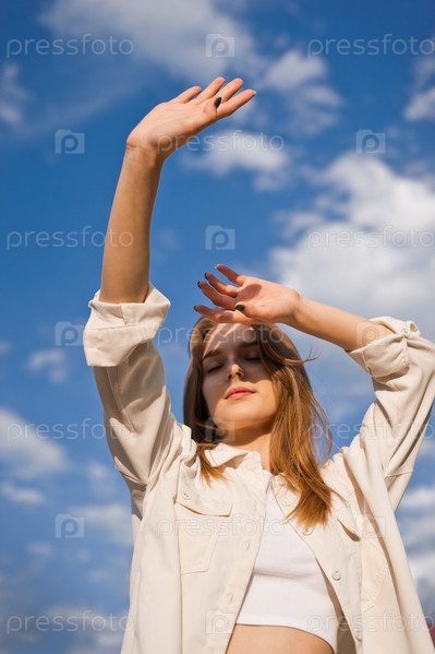 Портрет молодой девушки на фоне голубого неба и облаков 3696