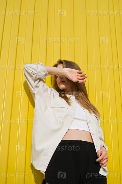 Девушка на фоне ярко-желтого листа железа 3702