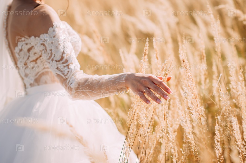 Жених и невеста идут по пшеничному полю летом 4248 года