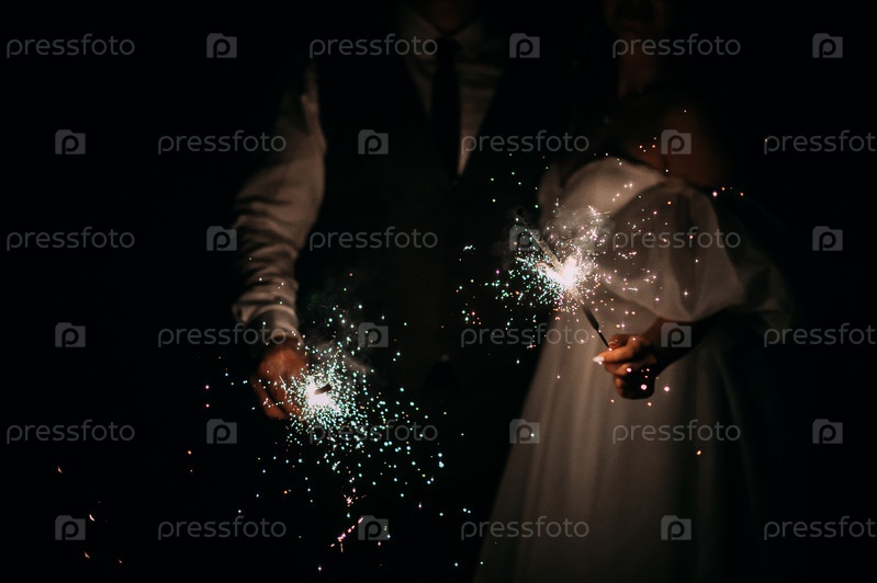 Бенгальские огни в руках молодоженов в темноте ночи 4335