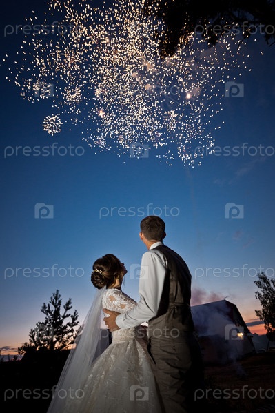 Объятия молодоженов на фоне вечернего фейерверка 2791