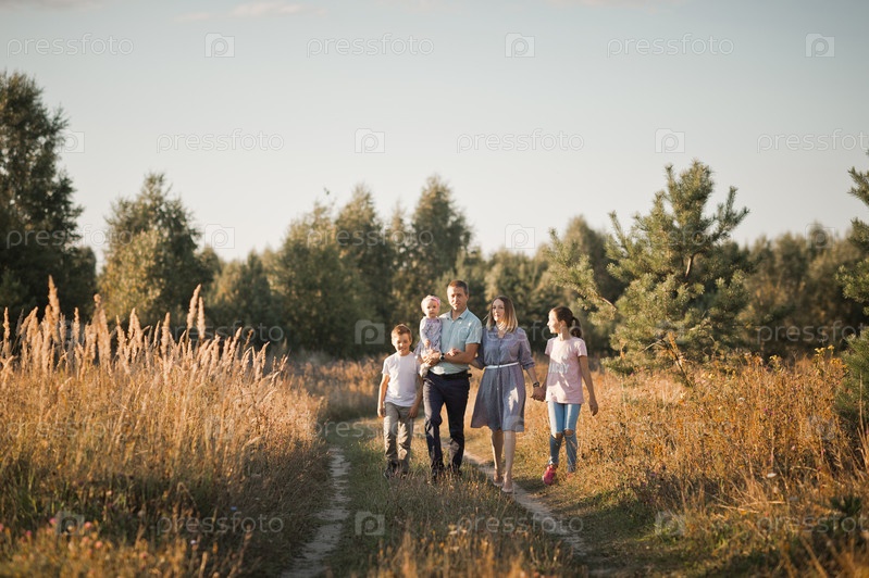 Большая семья идет по луговой дороге 3472