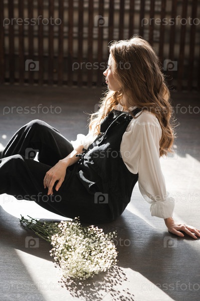Беременная девушка в комбинезоне на фоне фотостудии 4106