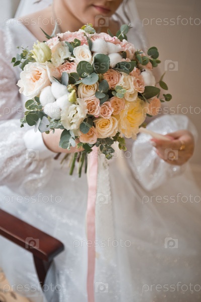 Невеста рассматривает нежный букет из разноцветных роз 4357