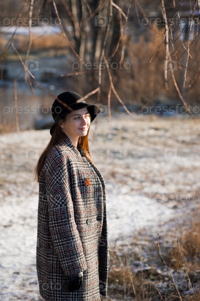 Весеннее фото девушки в шляпке и сером пальто на фоне тающего снега