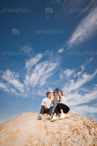 Семья позирует, стоя на песчаной горе на фоне неба