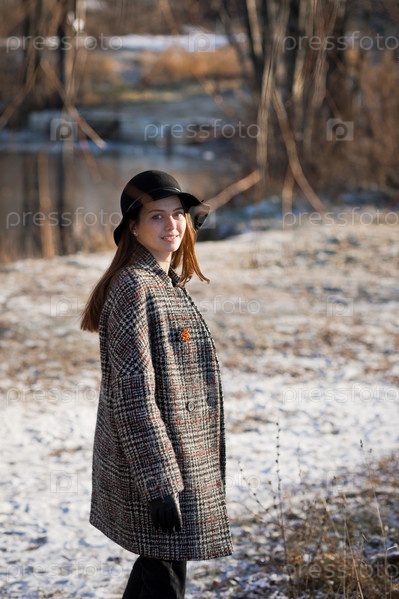 Весеннее фото девушки в шляпке и сером пальто на фоне тающего снега 3477