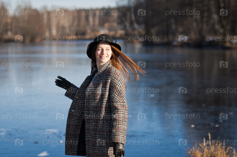 Девушка в пальто на фоне снега весной 3482