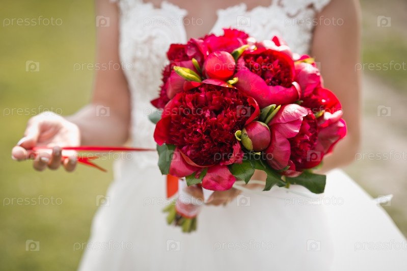 Красивый букет ярко-красных пионов в руках девушки 2825
