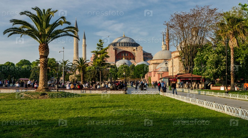 Стамбул, Турция - 02 мая 2018 г.: Редакция: Собор Святой Софии вечером на фоне голубого неба весной в Стамбуле, Турция