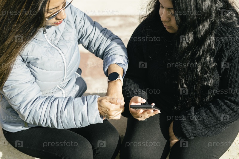 На этой стоковой фотографии две латиноамериканки сидят вместе и обмениваются данными с умными электронными устройствами. Обе женщины смотрят на свои устройства, которые отображают информацию на экранах. Одна женщина держит смартфон, а перед другой планшет