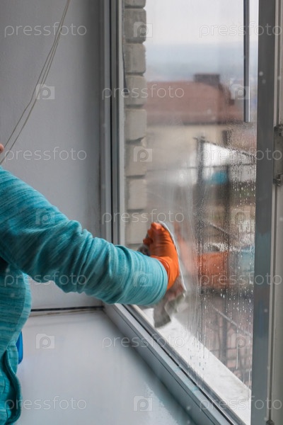 Женщина в оранжевой перчатке протирает окно тряпкой. Понятие чистоты в доме