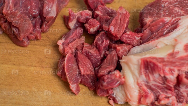 Мясо красной говядины, нарезанное на куски, лежит на старой разделочной доске