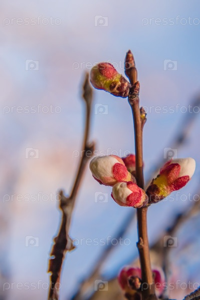 Веточка груши с розовыми и белыми бутонами, которые вот-вот распустятся