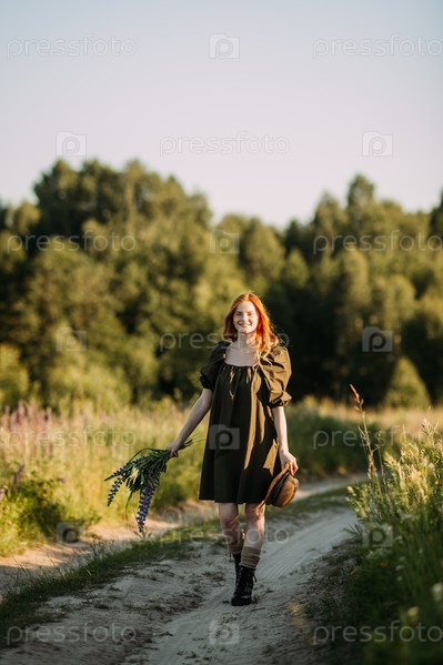 Деревенская рыжеволосая девушка идет по сельской дороге летом 3287 года