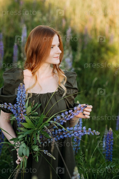 Красивая рыжеволосая девушка в зарослях люпина 3286