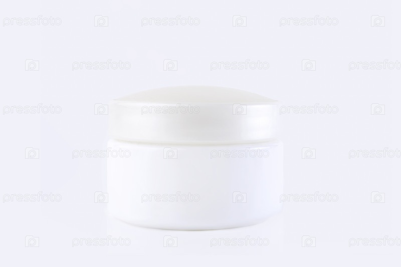 Белая банка со сливками на белом фоне. Стильный вид изделия, макет