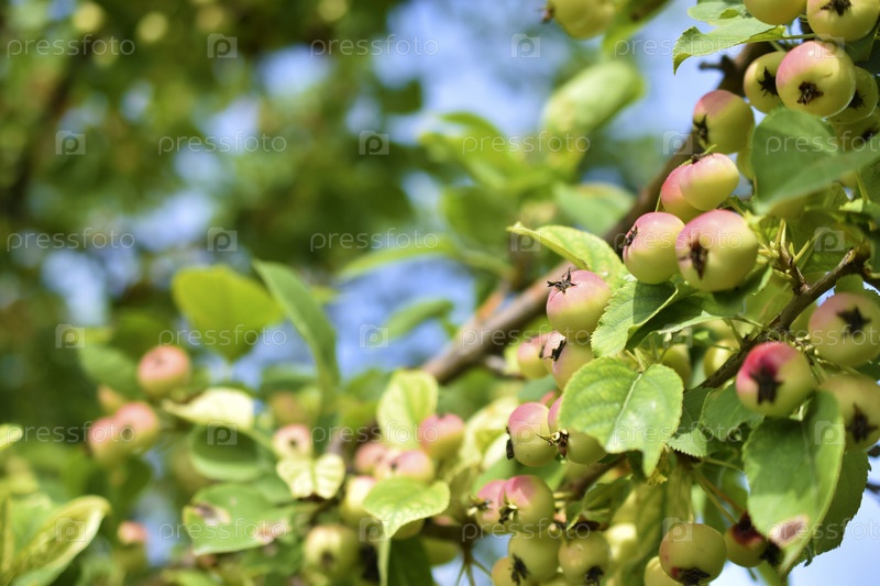 Желто-красные плоды дикой яблони на ветвях