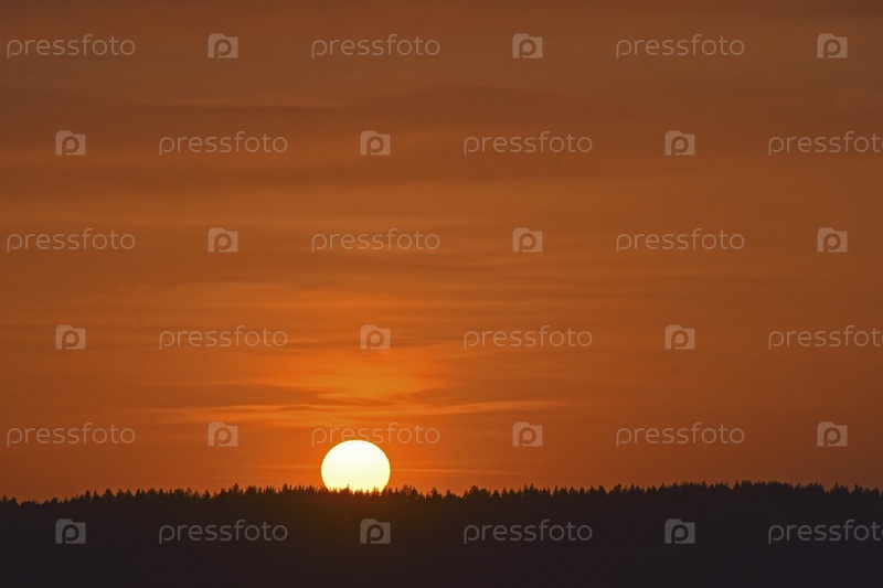 Закатное солнце на фоне горизонта с деревьями