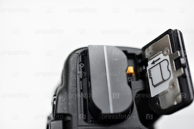 Аккумулятор зеркальной камеры. Замена батареи камеры крупным планом. Аккумулятор камеры находится в руке фотографа