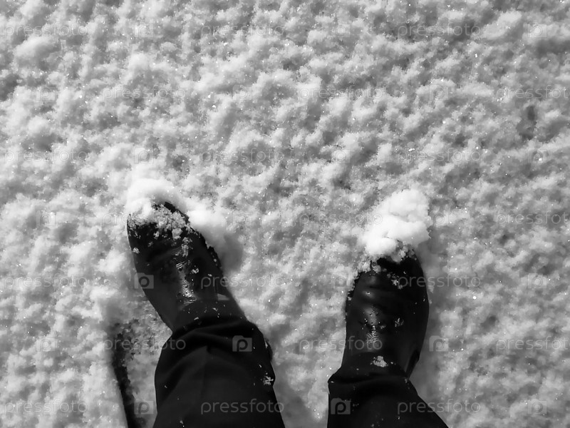 Ноги в сапогах на снегу, вид сверху. Сапоги и штаны в снегу
