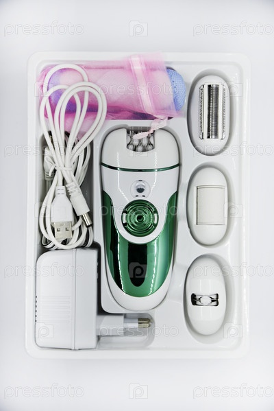 Женская электробритва для интимных мест. Набор женской бритвы для волос на белом фоне. Белая электрическая бритва