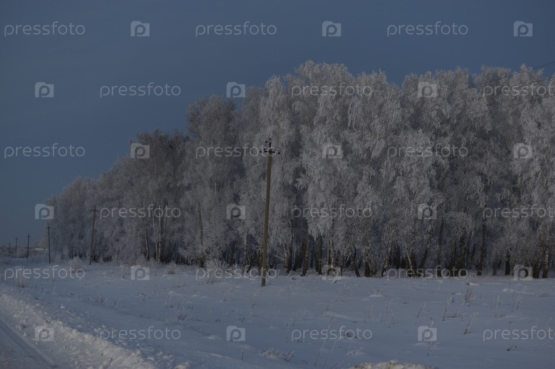 Зимний вечерний лес и заснеженные деревья. Красивый лес в снегу поздно вечером. Зимнее поле в деревне