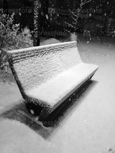 Снежный день в парке. Деревянная скамейка в снегу снежным вечером. Снегопад в парке отдыха