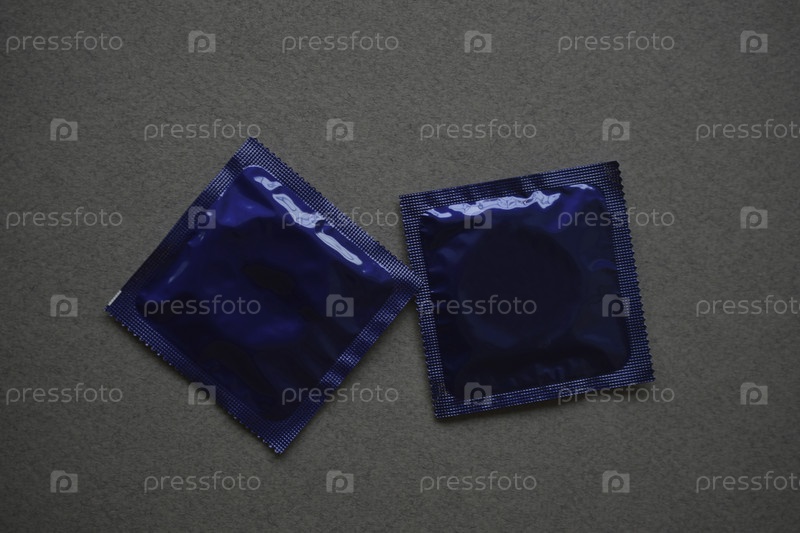 Презервативы в синей оболочке на сером фоне