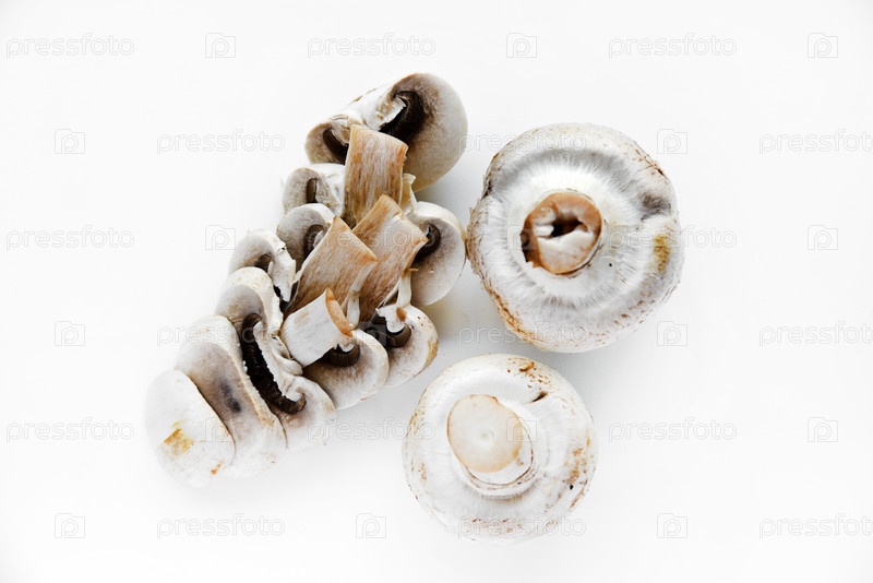 Несколько грибов шампиньонов на белом фоне. Хороший шампиньоны крупным планом