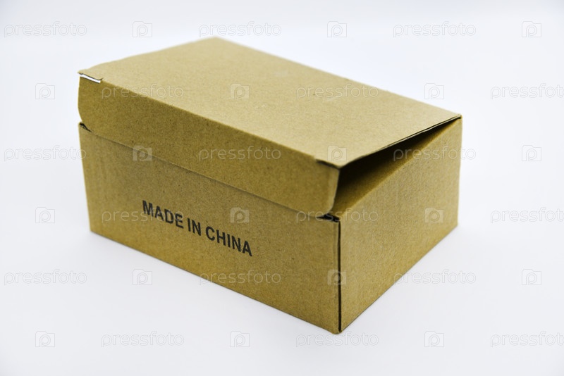 Картонная коробка с надписью сделано в Китае. Коробка на белом фоне. Небольшая коробка китайского производства на белом фоне