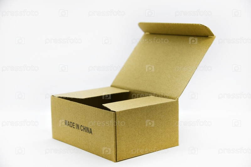 Картонная коробка с надписью сделано в Китае. Коробка на белом фоне. Небольшая коробка китайского производства на белом фоне