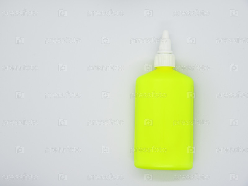 Ярко-зеленая бутылка клея на белом фоне. Красивая трубка крупным планом. Зеленая пластиковая бутылка