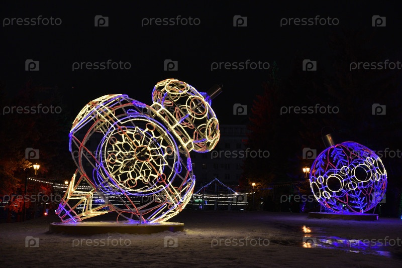 Скульптуры с подсветкой в виде елочных игрушек в парке ночью. Красивые гигантские елочные игрушки с огнями в городе. Скульптуры с подсветкой