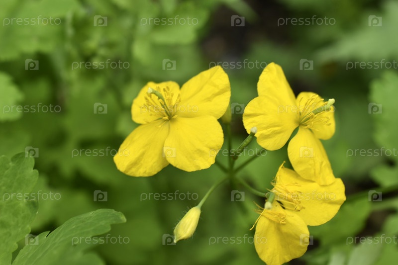 Желтые цветы на зеленом фоне. Красивые желтые цветки чистотела. Макрофото. Хелидониум