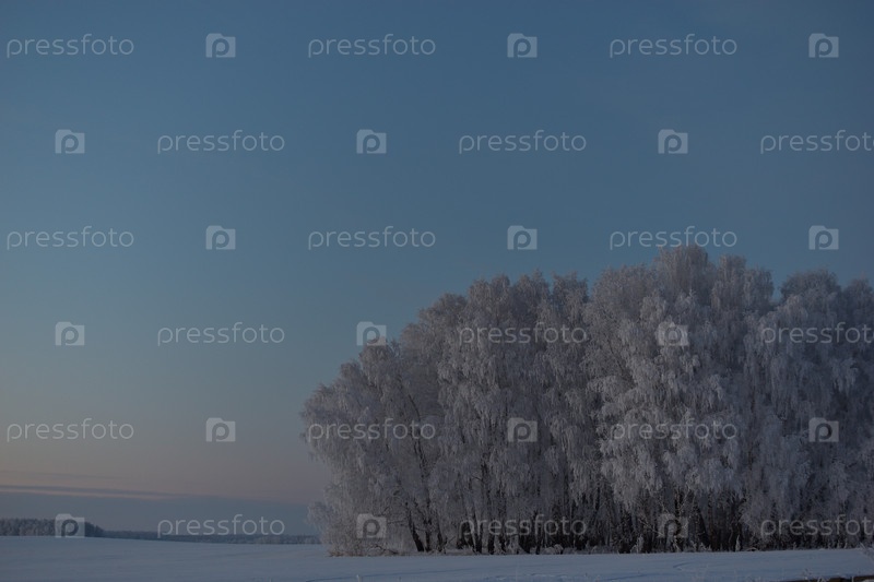 Зимний вечерний лес и заснеженные деревья. Красивый лес в снегу поздно вечером. Зимнее поле в деревне