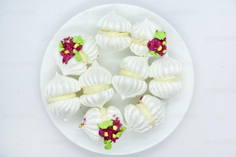 Белый зефир на белом фоне. Вкусные и сладкие меренги