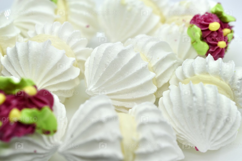 Белый зефир на белом фоне. Вкусные и сладкие меренги