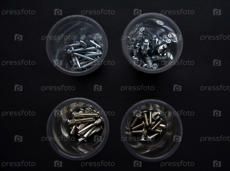 Строительные болты и винты в пластиковых стаканчиках на черном фоне. Строительные принадлежности